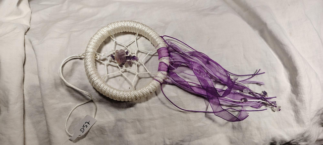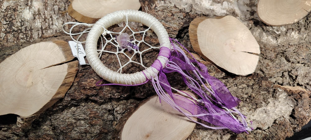 Attrape rêve, support plastique, fil nylon, perles chips améthyste et un cube de Fluorine au centre.