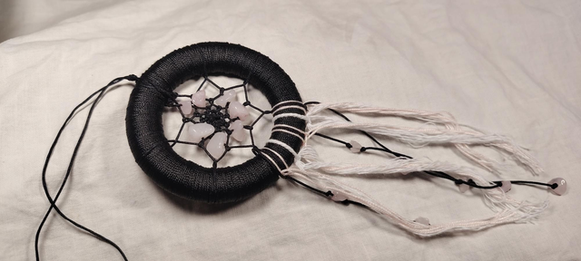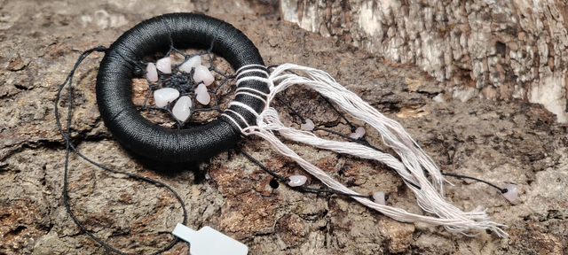 Attrape rêve, support bois, fil nylon, perles chips en quartz rose.
