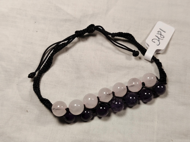 Bracelet micro macramé réglable, 6 à 9 cm de diamètre, perles en améthyste et quartz rose.