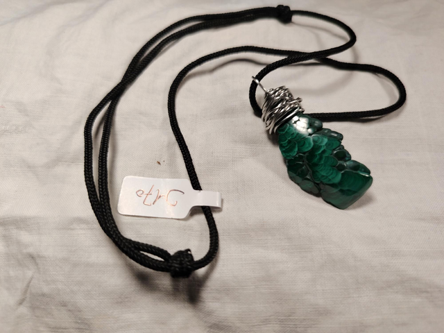 Collier nylon réglable, pendentif malachite polie serti acier inoxydable.