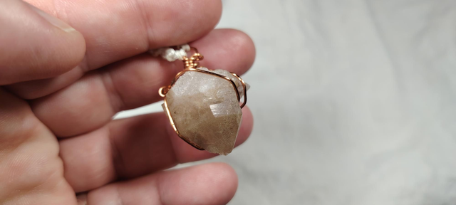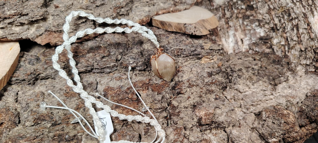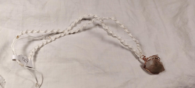 Collier nylon en macramé réglable, 60 cm, avec perles chips en quartz et pendentif en cristal de quartz serti fil cuivre.