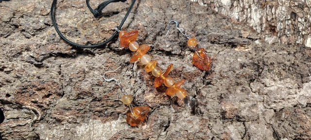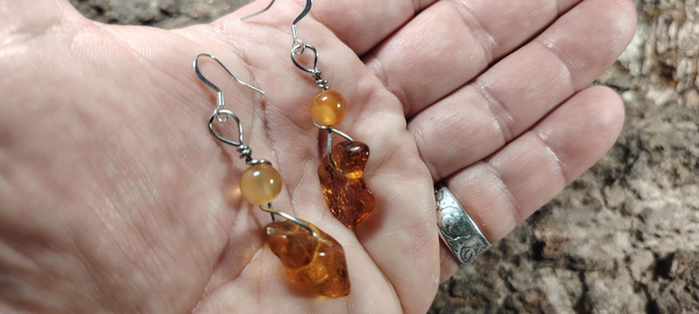 Boucles d'oreilles acier inoxydable avec perles chips en ambre et perles en cornaline.