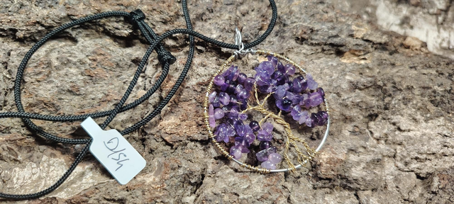 Collier cordon nylon réglable, avec pendentif arbre de vie, perles chips en améthyste, serti acier inoxydable et fil laiton, diamètre 5cm, 16 gr.